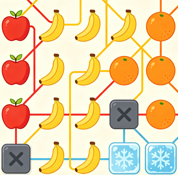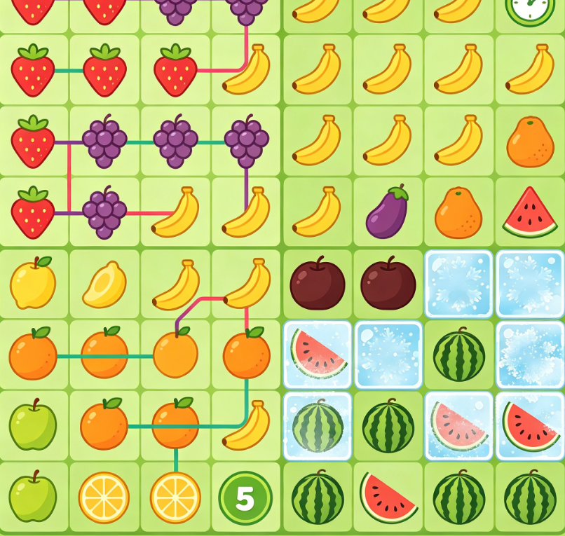 This fruit-themed line-connecting puzzle game challenges players to clear the board by swiping to link adjacent, identical fruits; the longer the connection path, the higher the score. The game features approximately 65 levels, starting with simple connection tasks and gradually introducing obstacles—such as special “blocker” fruits, frozen tiles, and time limits—in later stages. Certain levels require players to reach a specific score or clear particular types of fruit to advance. While the gameplay is intuitive and easy to pick up, as players progress through the levels, the demands on their path-planning skills steadily increase.