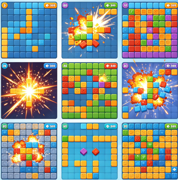 A match-and-clear game centered around explosive mechanics, players tap on clusters of same-colored blocks to trigger a blast—the larger the cluster, the higher the score. The game features approximately 70 levels, gradually introducing mechanics such as chain reactions, special blocks (e.g., cross-shaped blasts and full-screen clears), and complex obstacles. Certain levels require players to complete specific blasting objectives within a limited number of moves, thereby enhancing the strategic depth and sense of challenge.