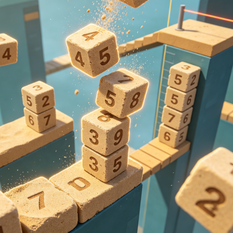 This game features a creative gameplay concept that combines physical stacking with digital synthesis. Players control falling sand blocks—each bearing a number—and stack them; when blocks with identical numbers come into contact, they automatically merge and upgrade. The game comprises approximately 95 levels, gradually introducing new challenges—ranging from unstable structures and tilted platforms to height restrictions—that build upon the foundational stacking mechanics. Later levels emphasize spatial utilization and structural stability, requiring players to exercise precise control over both placement and timing.